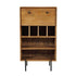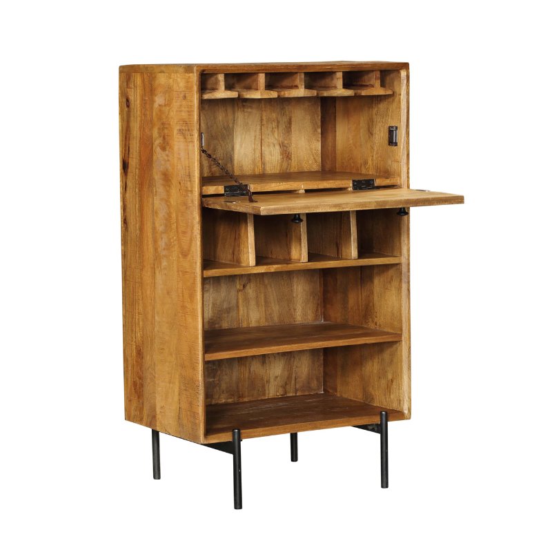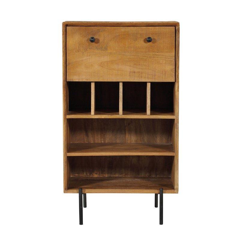 Wijnkast Portland is uitgevoerd in mangohout met een metalen poot. Dit model is voorzien van één klepdeur met daar achter een rek voor wijnglazen. De kast is ingelegd met verschillende stroken gelakt hout. Onder de klepdeur bevindt zich een vak voor vier wijnflessen en daaronder nog twee openvakken.