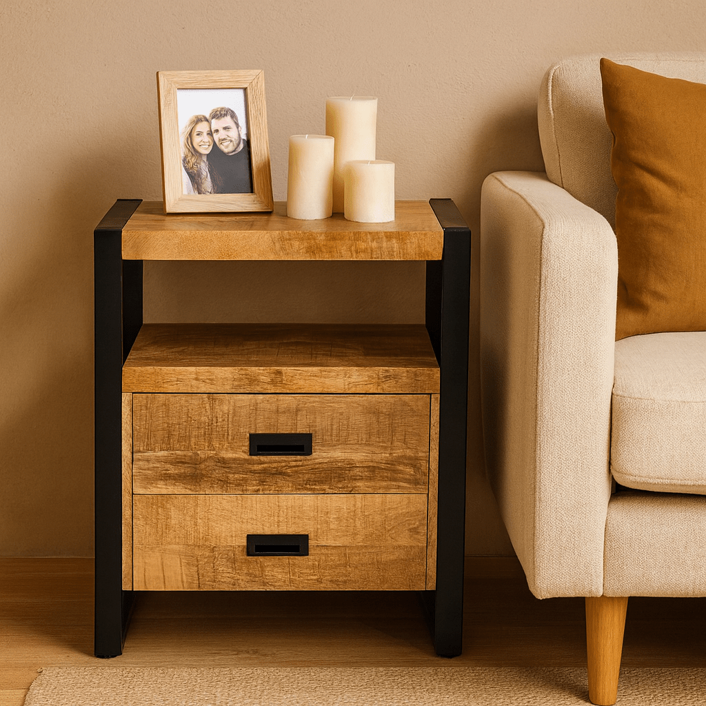 Breng warmte en karakter in je interieur met dit industrieel kastje, vervaardigd uit massief mangohout en robuust zwart staal. Het kastje heeft twee ruime lades die niet alleen praktisch zijn, maar ook een stoere, eigentijdse uitstraling toevoegen aan je woonruimte. Het samenspel van natuurlijke houtstructuren en strakke metalen details maakt dit meubelstuk tot een echte blikvanger.