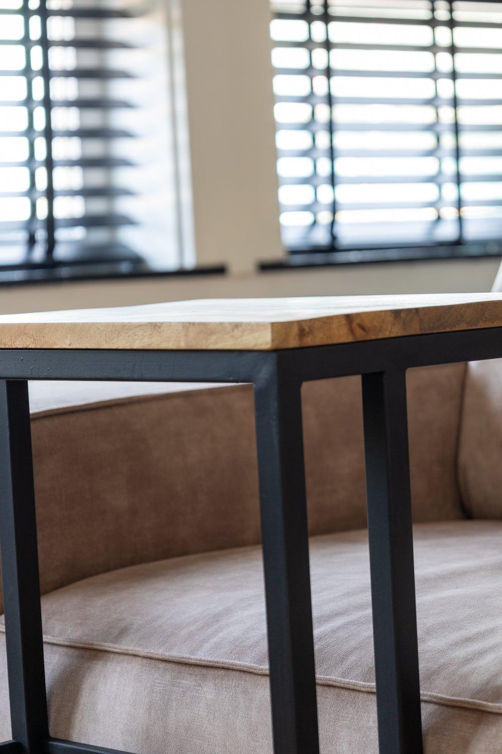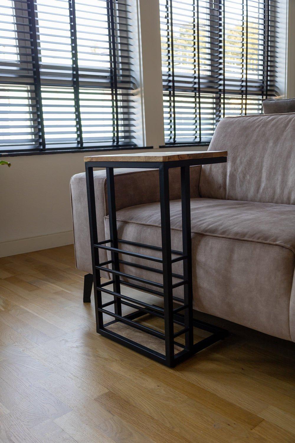 Dieser praktische Beistelltisch für über dem Sofa ist ideal. Er nimmt keinen Platz weg, da Sie die Beine unter das Sofa schieben können. Achten Sie also darauf, dass Ihr Sofa Beine hat, damit dieser praktische Beistelltisch über das Sofa passt! Dieser Beistelltisch ist aus schwarzem Stahl und massivem Mangoholz gefertigt und sorgt für einen warmen, exklusiven Look.